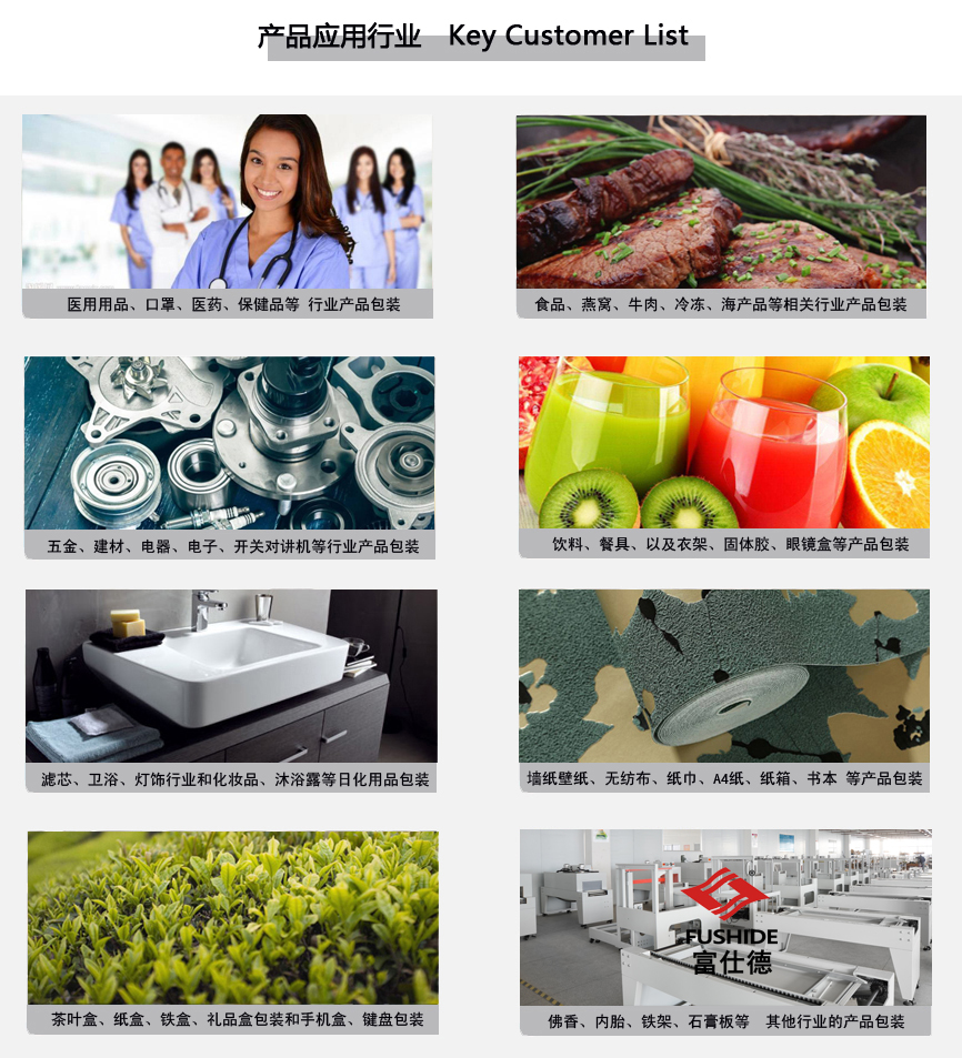 富仕德牌全自動熱收縮膜包裝機應用行業(yè)廣泛,專為以下多個行業(yè)產品提供產品外膜包裝: